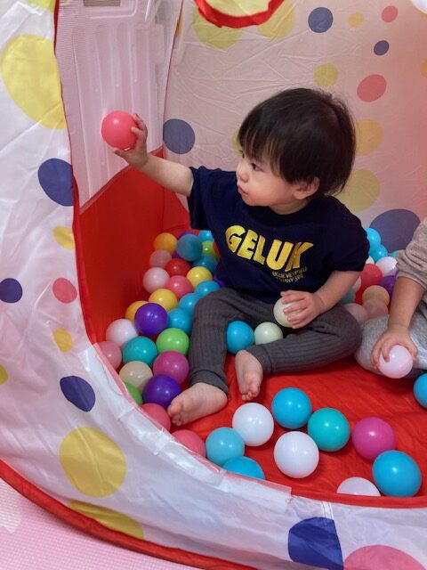 ハウスの中に入ってカラーボールをポーンと投げたり、トンネルをくぐって遊んで楽しんでいました。