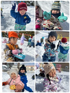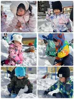大きな雪の塊の上に乗って、『しゅっぱつ!』とバスや電車に見立ててお友達と楽しく遊ぶ様子がみられました。
