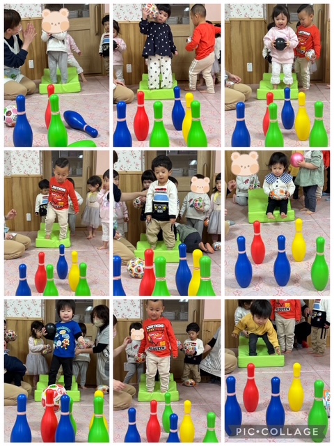 初めはなかなか倒せなかった子も何度も繰り返しチャレンジして、上手に倒すことができるようになりました。「できた、すごいね」と保育者とハイタッチをしたり、みんなで拍手をして喜びました。