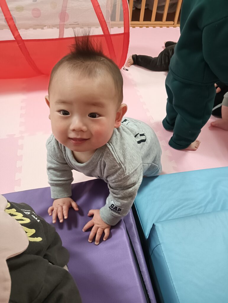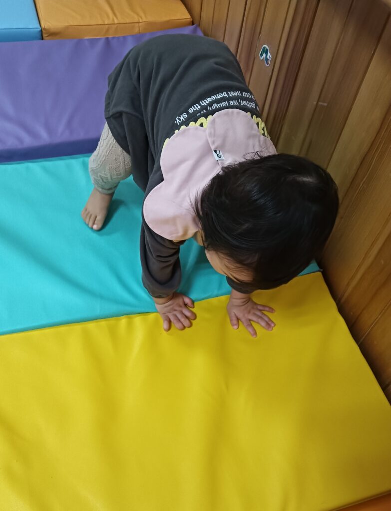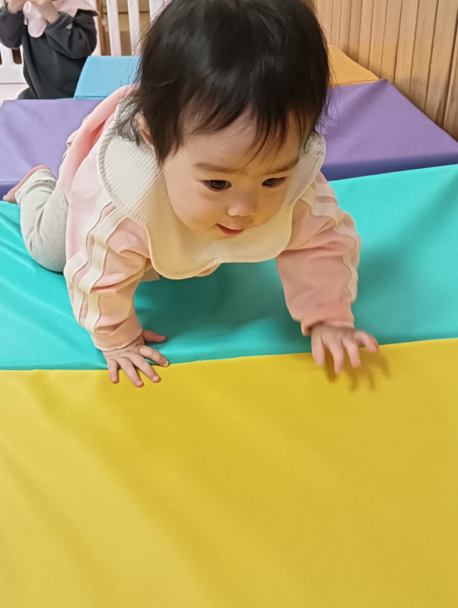 折りたたみマットで作った坂を歩いて渡ったり、ハイハイで降りたり、ゴロンゴロンと転がって降りたりと、様々な体勢で身体を動かして楽しみました。