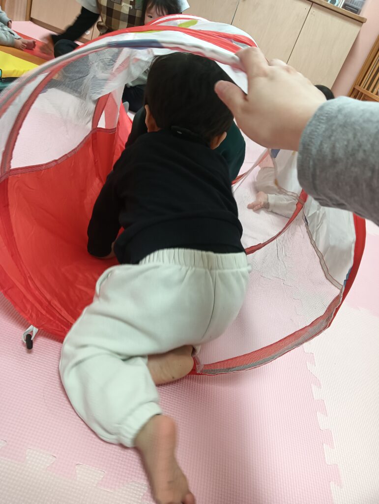 トンネルをくぐるのにも少しずつ慣れて、顔をのぞかせたり、くぐり抜けていた子ども達です。
