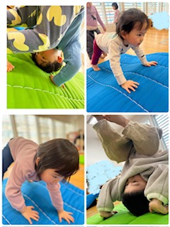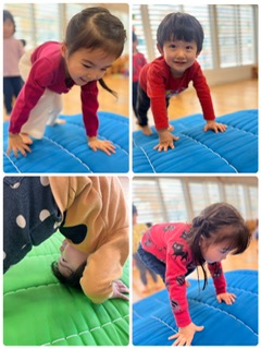 今日は【マット運動】をしました。傾斜をつけたマットを作り、坂登りと前転をしました。