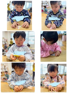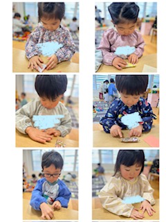 初めて折り紙に挑戦し、御代理様とお雛様の服を作りました。折り紙の柄をしっかり選んで決めている姿が可愛らしい子どもたちです。