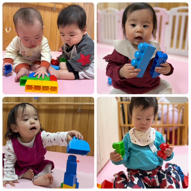 ブロック同士をぶつけてカンカン音を鳴らしたり、保育者と組み立てて楽しみました!