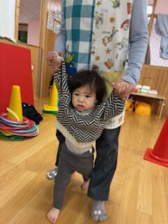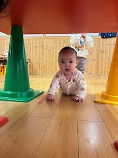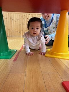 初めはトンネルをくぐるのに少しドキドキした様子でしたが、お友達がハイハイしてくぐる様子を見たり少しずつ慣れてくると意欲的にハイハイしてくぐる姿も見られました。
