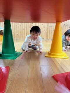 コーンで作られたトンネルをくぐったり、段差を昇降したりして身体を動かしました。