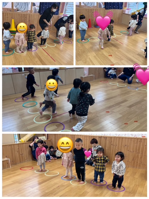 1人ずつフープの中に入り向こう側にあるフープを目指して走ります。真っ直ぐではなくそれぞれが好きな色のフープを目指して走る姿が可愛らしかったです。