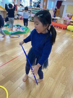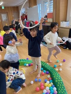 フラフープの中にボールを集めたり、ジャンプをしたり、自分たちで遊びを考えている姿に感心しました。