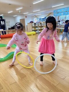またフラフープを床に置いて回す遊びもしていました。