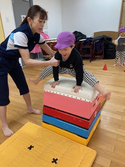 跳び箱でも跳び箱前転を講師の補助ありで全員挑戦しました