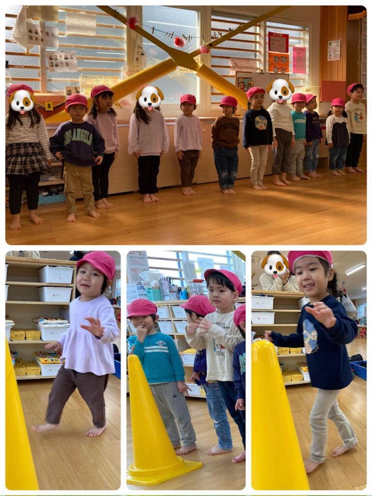 手押し車は、まだ腕の力が弱くグニャグニャになっていて、進む方も足を持つ方も大変そうでしたが、みんな諦めずにゴールを目指す、素敵な姿が見られました。