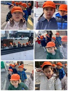 今まで先生と手を繋いでいましたが進級に向けてお友達と手を繋いで列になって歩く練習をしました。車や草花など目についたものに向かってしまい、列が乱れることもありましたが、歩いていくうちに前のお友達の後ろを意識して上手に歩けていました。