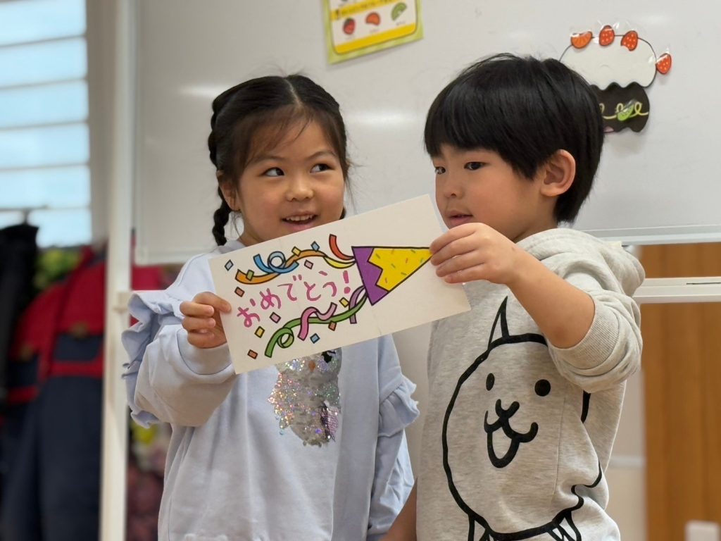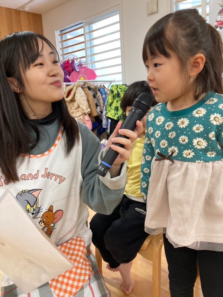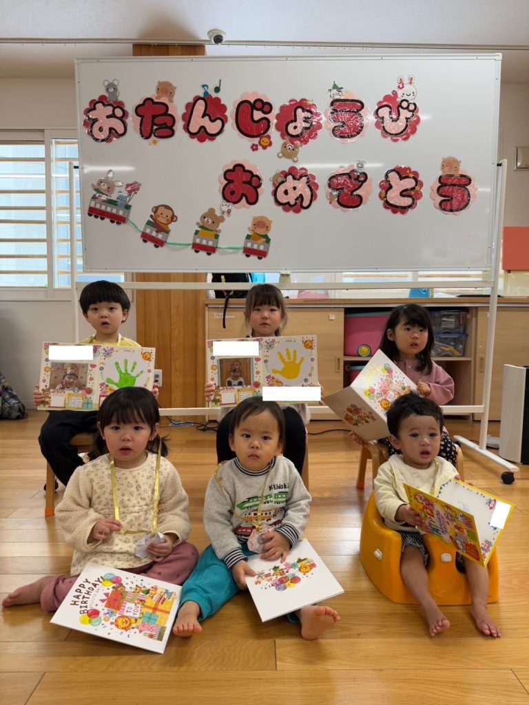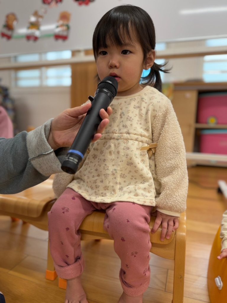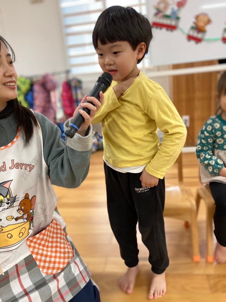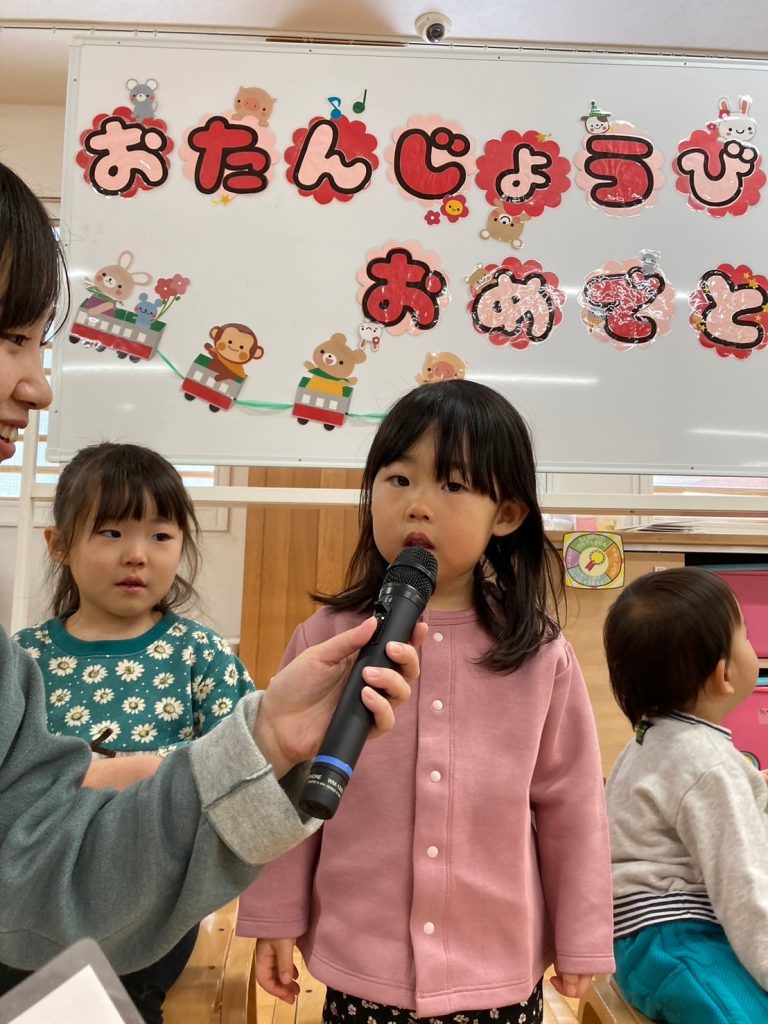 今日は1月生まれのお友達のお誕生日会でした。インタビューでは、大きなお友達は「郵便局で働きたい」「ヒーローになりたい」など、様々な夢をお話ししてくれました。小さいお友達は、好きな食べ物を聞くと「いちご」とはっきり答えることができていました。