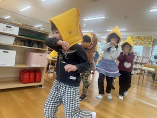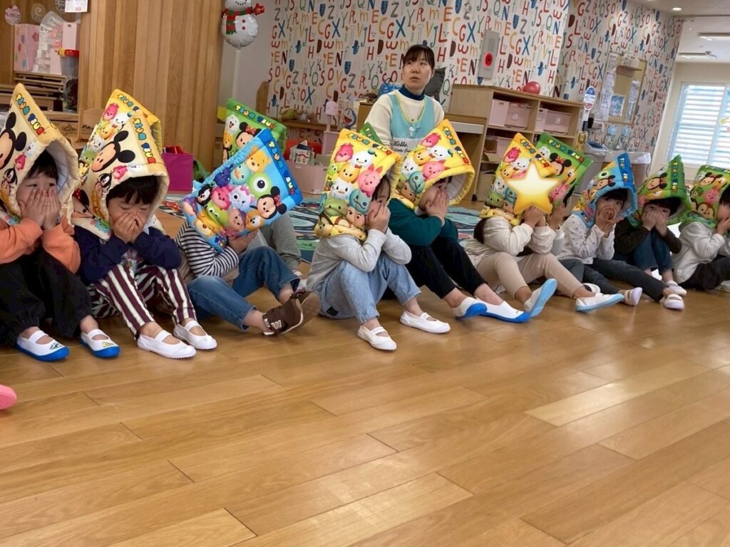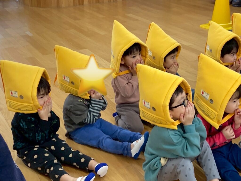 2歳児・3歳児のお友達は、自分で防災頭巾を被って避難靴を履き、スムーズに避難できました。まだ補助が必要な部分もありますが、進んで自分で行う姿が増えました。