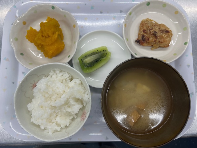 鶏肉の胡麻焼き、南瓜の含め煮、キウイ