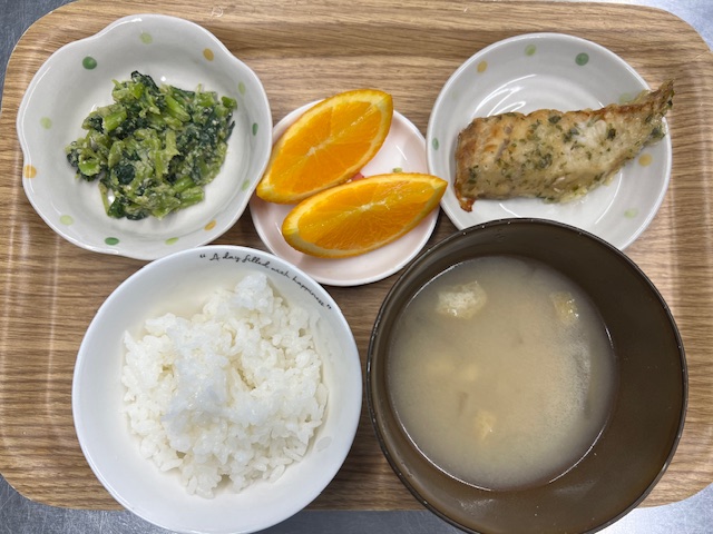 ほっけの磯部焼き、小松菜ごま和え、オレンジ