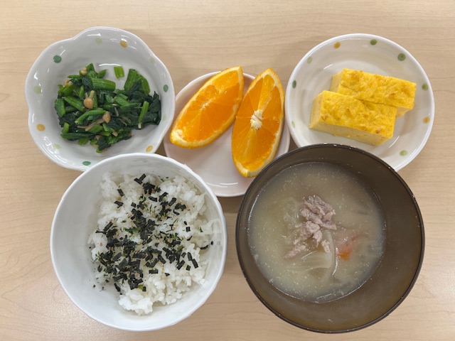 厚焼き卵、ほうれん草のなめたけ和え、オレンジ