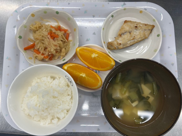 さばの味噌焼き、切干大根煮、オレンジ