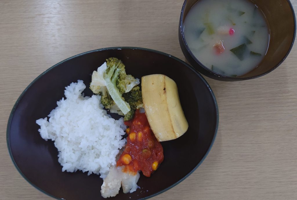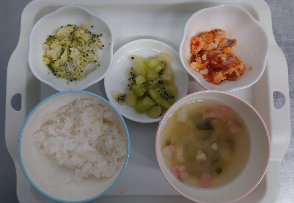 軟飯、味噌汁(小松菜、焼ふ)、たらのトマトソース、味噌マヨネーズ、キウイ