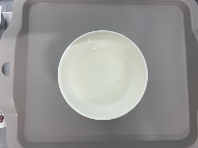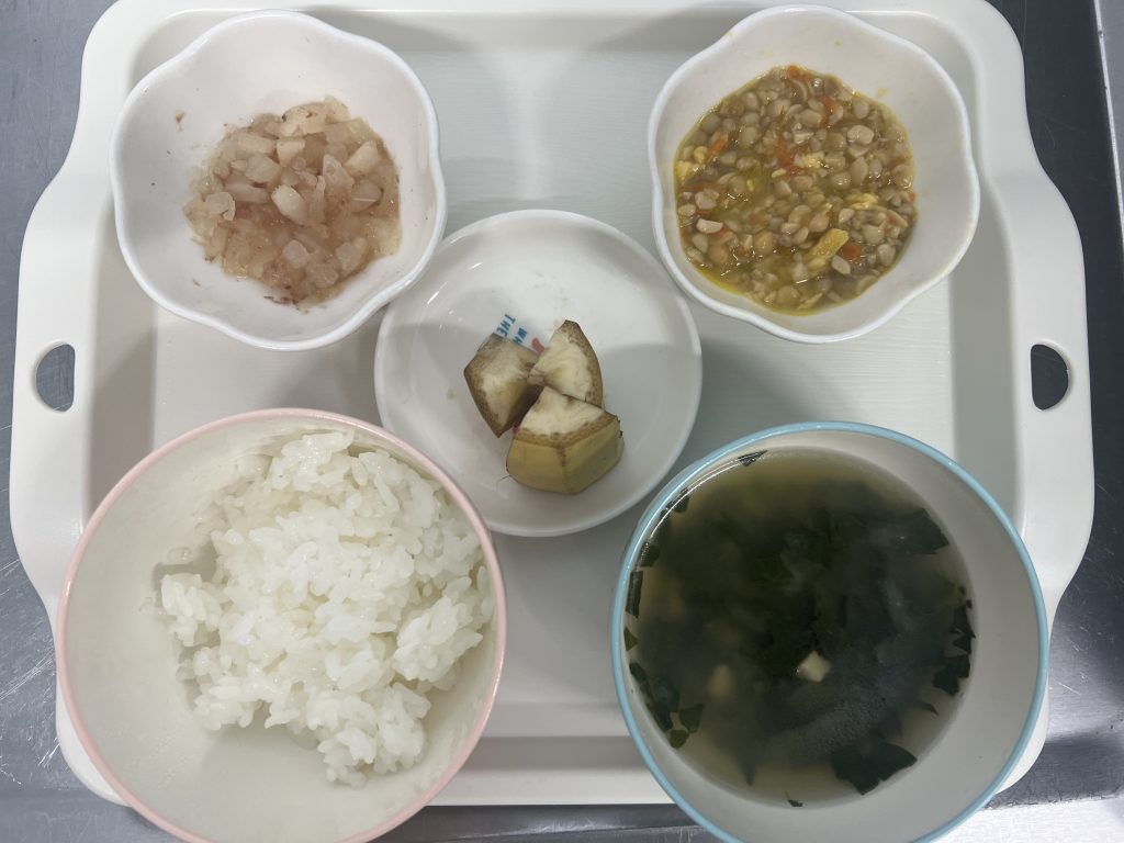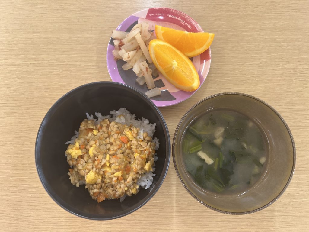2025年04月17日(木) 4月17日 給食 ☆幼児食御飯、炒め納豆味噌汁(ほうれん草、油揚げ)大根おかか和え、オレンジ ☆離乳食(カミカミ期)軟飯、炒め納豆味噌汁(ほうれん草、油揚げ)大根おかか和え、バナナ ☆離乳食(ゴックン期)つぶし粥