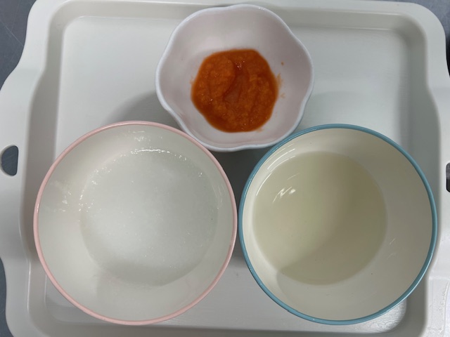 2025年05月15日(木) 5月15日 給食 ☆幼児食 御飯、味噌汁(木綿豆腐、ほうれん草)ヒレカツ、白菜胡麻和え、オレンジ ☆離乳食(カミカミ期) 軟飯、味噌汁(木綿豆腐、ほうれん草)ヒレカツ湯通し、白菜胡麻和え、バナナ ☆離乳食(ゴックン期) 粥、スープ人参煮潰し
