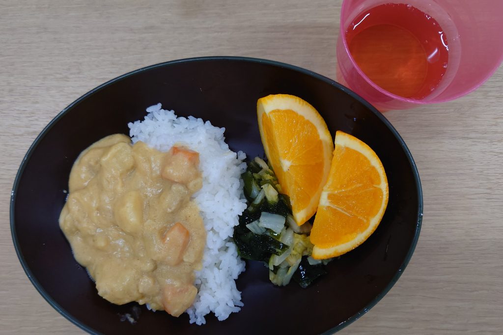 麦茶、チキンカレー、白菜わかめ和え、オレンジ
