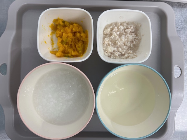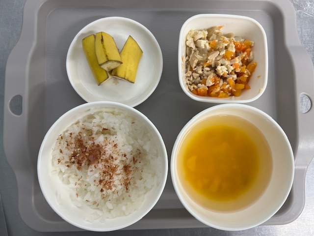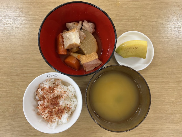 2026年02月05日(木) 2月5日 給食 ☆幼児食ふりかけご飯味噌汁(南瓜)しょうゆおでんバナナ ☆離乳食(カミカミ期)軟飯ふりかけ味噌汁(南瓜)しょうゆおでんバナナ ☆離乳食(モグモグ期)粥スープ鶏挽肉大根あんかけ煮南瓜煮