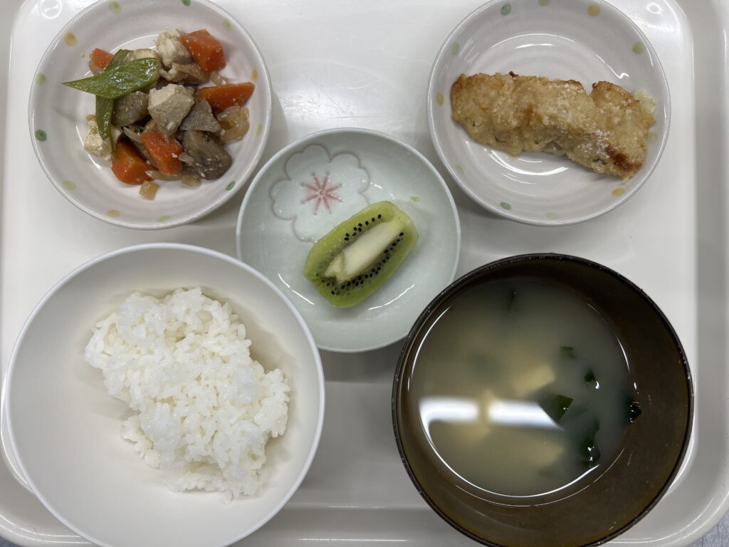 2026年03月24日(火) 3月24日 給食 ☆幼児食 ご飯 味噌汁(木綿豆腐、ほうれん草) たらの胡麻焼き ごぼうと人参の炒め煮 キウイ ☆離乳食(モグモグ期) 粥 スープ たらほうれん草あんかけ煮 人参スティック煮 ☆離乳食(ゴックン期) つぶし粥 スープ たら煮つぶし 人参煮つぶし